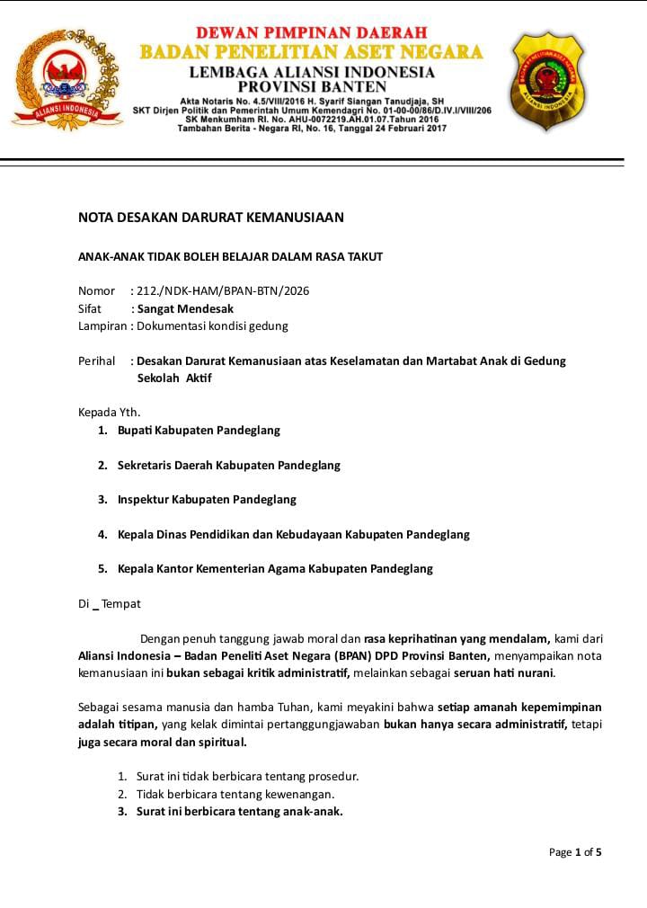 Nota ini disusun bukan sebagai kritik administratif, melainkan sebagai seruan hati nurani, setelah BPAN mendokumentasikan kondisi fisik sekolah yang mengalami kerusakan berat namun tetap digunakan untuk kegiatan belajar mengajar.