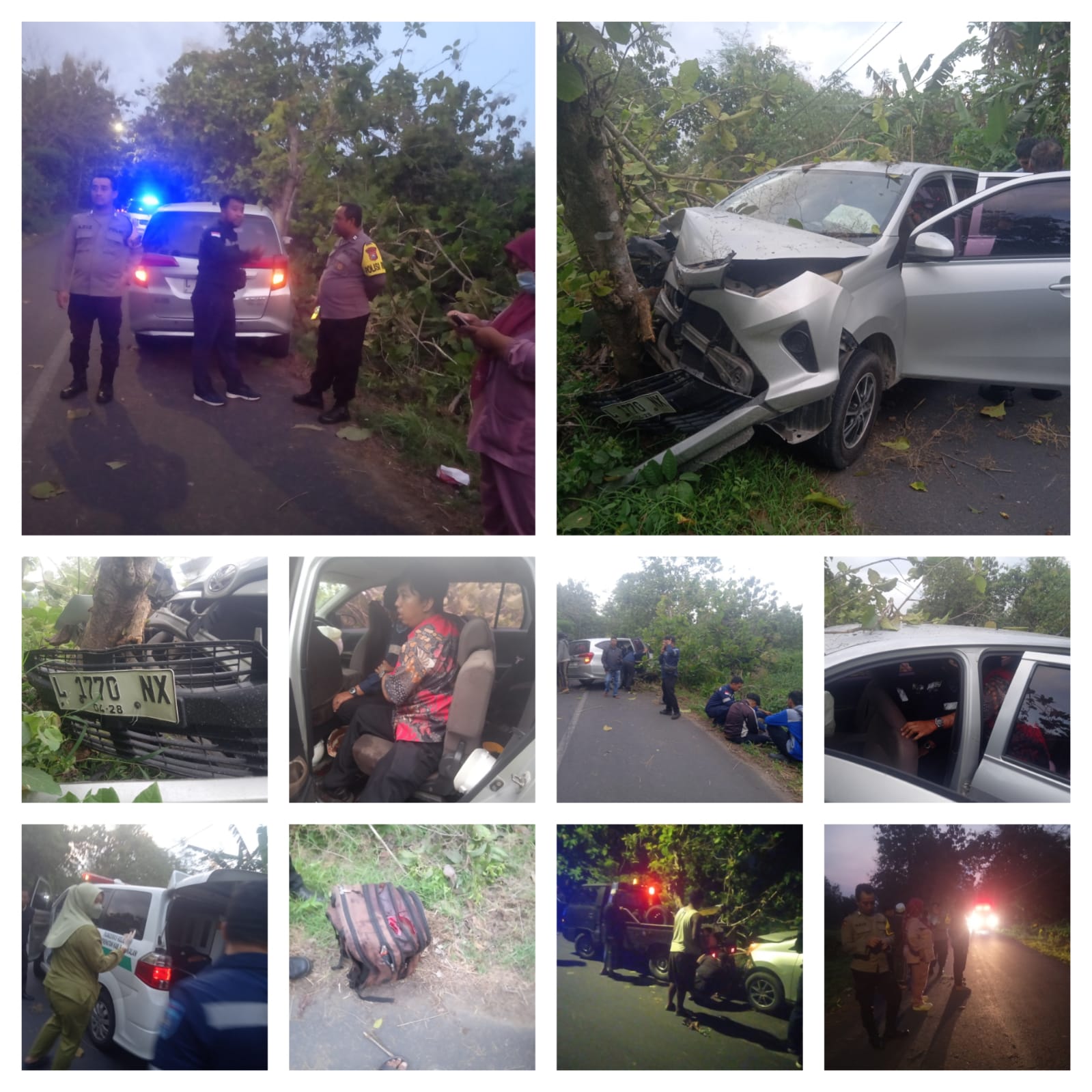 Sebuah mobil Toyota Calya bernopol L 1770 NX mengalami kecelakaan tunggal setelah menabrak pohon di pinggir jalan. Kendaraan tersebut diketahui membawa enam orang penumpang yang merupakan rombongan karyawan PT Darma Lautan.