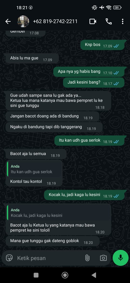 Pengancaman tersebut dilakukan melalui pesan singkat WhatsApp oleh seseorang bernama Rendi. Dalam percakapannya, terduga pelaku melontarkan kata-kata kasar disertai ancaman kekerasan serta upaya fitnah terhadap korban.