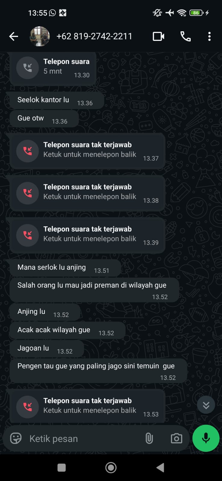 Isi pesan tersebut antara lain berbunyi, “Angkat anjing… mau tau gue siapa kan, sharelok kantor lu… salah orang lu… kalo punya kantor gue injek-injek… lu masih bau kencur aja mau main sama gue,” disertai makian dan tudingan pencurian yang tidak berdasar.