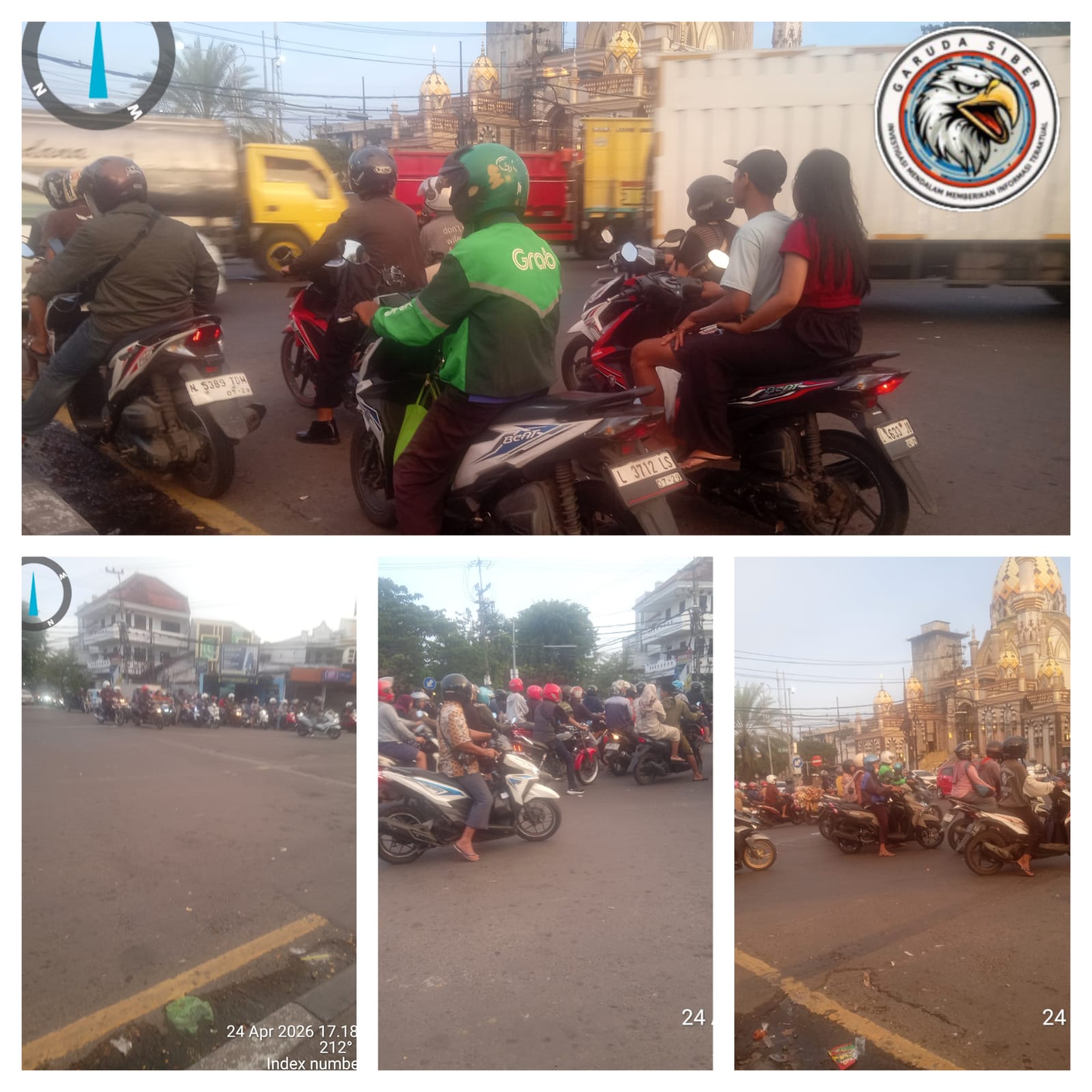Surabaya, 24 April 2026. Garudasiber.net – Tepat pukul 16.30 WIB, arus lalu lintas di simpang empat Jalan Kedung Cowek terpantau mengalami kemacetan yang cukup parah. Kepadatan kendaraan terjadi dari berbagai arah, baik kendaraan roda dua maupun roda empat, yang saling berebut melintas di persimpangan tersebut.