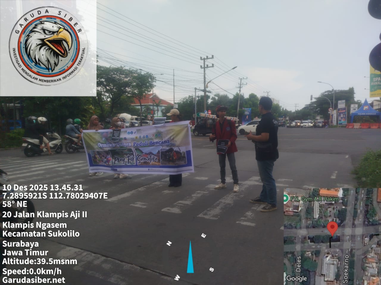Surabaya, Garudasiber.net – Rabu pagi (10/12/2025) di Surabaya terasa berbeda. Langit yang biasanya sibuk menaungi hiruk-pikuk kota, hari itu tampak seperti menahan duka. Tepat pukul 10.00 WIB, di bawah panas yang mengeringkan keringat, sekelompok mahasiswa Universitas W.R. Supratman Surabaya berdiri di simpang empat traffic light Jalan Arief Rahman Hakim, bukan untuk berdemonstrasi, bukan pula untuk berpamer akademik. Mereka berdiri untuk Sumatra, untuk suara-suara yang tertutup debu bencana, untuk harapan yang sedang berjuang agar tidak padam.