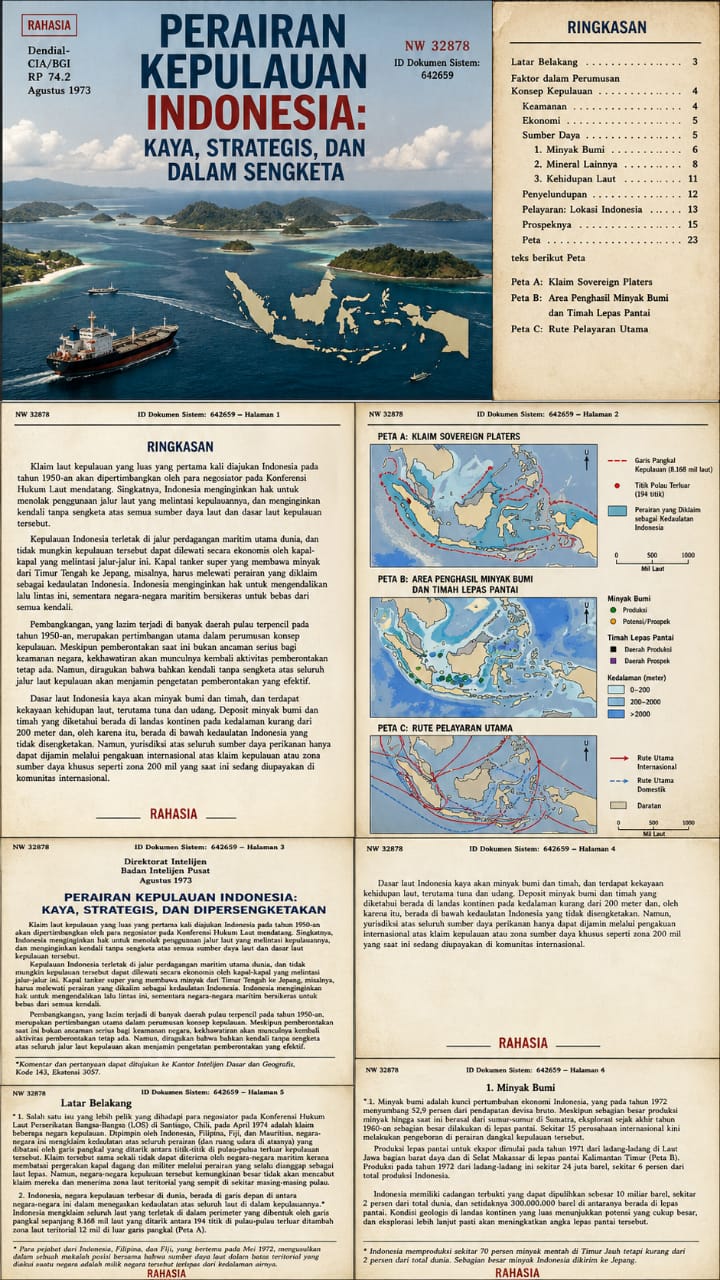 GarudaSiber.net | Jakarta, 25 April 2026 – Sebuah dokumen intelijen Amerika Serikat yang dideklasifikasi dengan kode NW 32878 ID Sistem: 642659 tertanggal Agustus 1973 mengungkap analisis Badan Intelijen Pusat AS (CIA) melalui Direktorat Intelijen Dasar dan Geografis (BGI) tentang betapa strategis dan kayanya perairan kepulauan Indonesia, sekaligus memaparkan sengketa klaim laut yang akan dibahas pada Konferensi Hukum Laut PBB 1974.