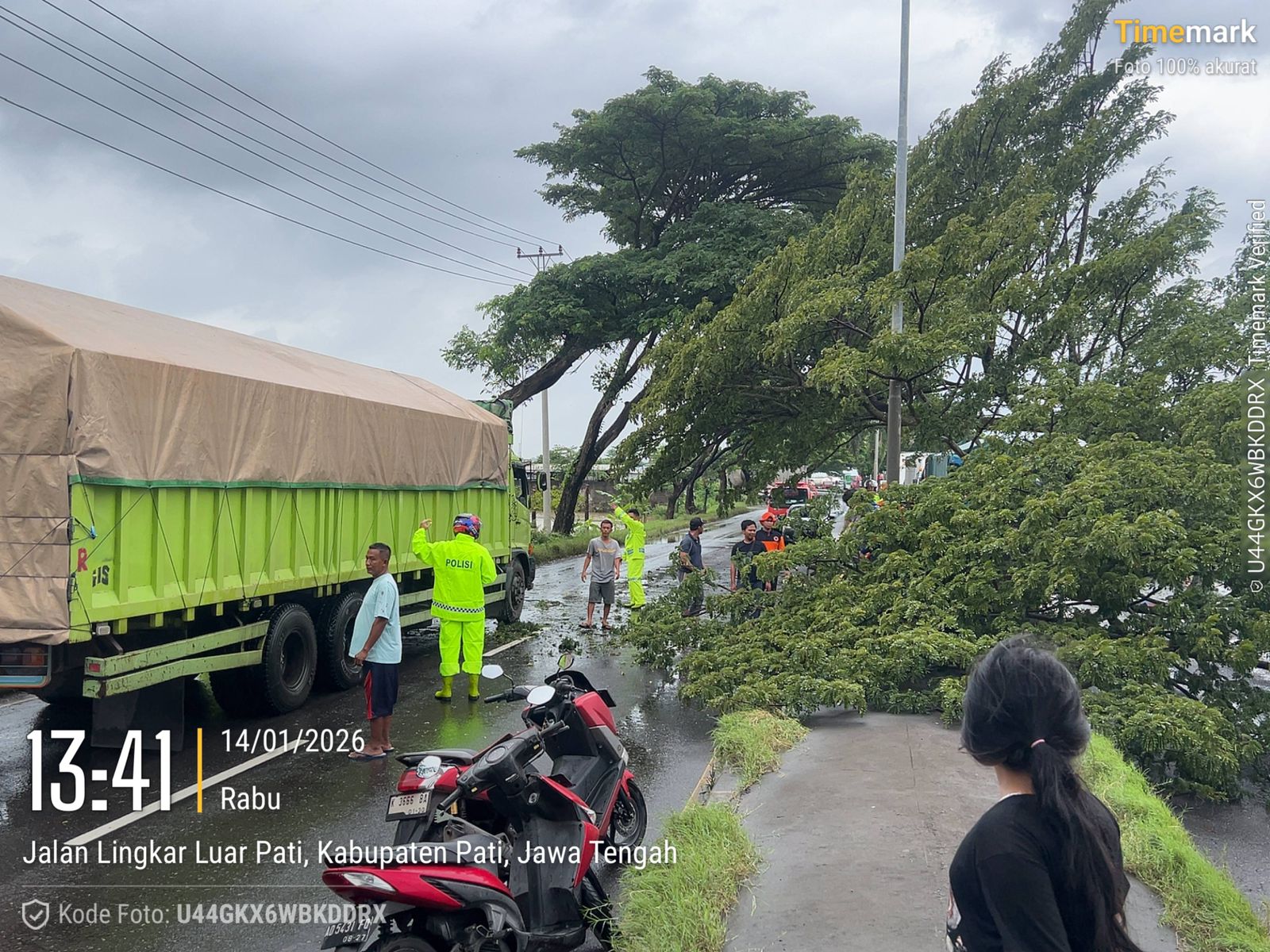Dalam waktu kurang lebih 30 menit, pohon tumbang berhasil disingkirkan dari badan jalan. “Sekitar pukul 14.13 WIB, arus lalu lintas di Jalan Lingkar Selatan Pati–Juwana sudah kembali normal dan aman dilalui,” tutur Kapolsek.